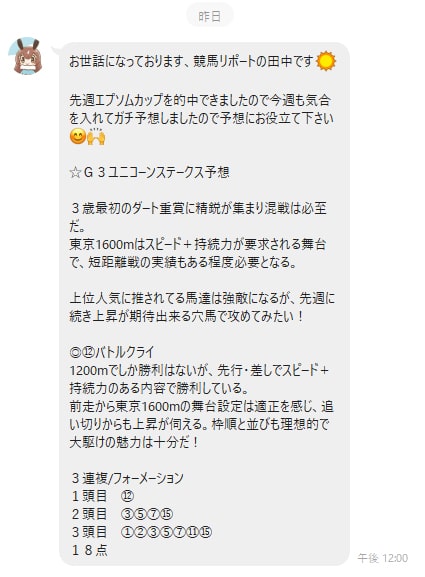 先週はLINE限定情報、管理人の田中ガチ予想でユニコーンSで3連複955.4倍の的中を届ける事が出来ました☆