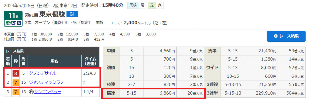 そして日本ダービーのことを期待していると書いてありますが、無料情報でそのダービーの結果をお伝えしたいと思います。