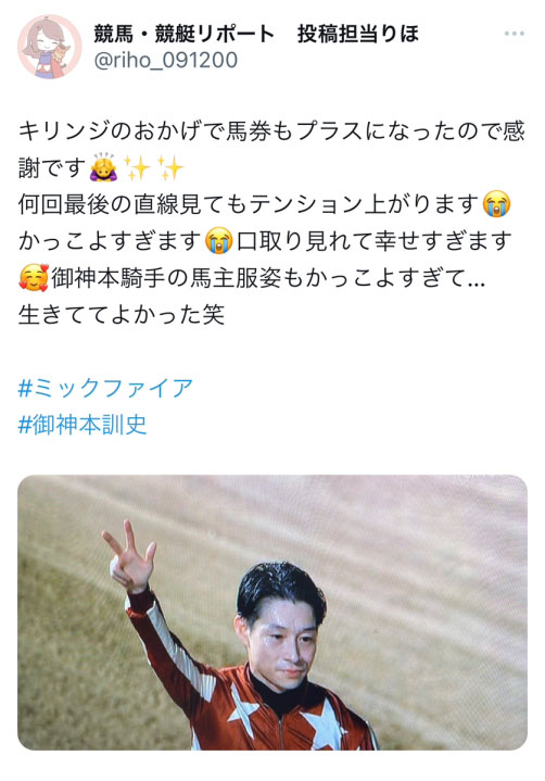 そして御神本騎手のファンの部下のりほさんがTwitterで喜びを爆発させていました。