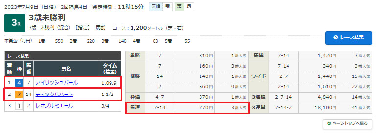 1、3番人気で決まりました。トリガミにならなくてよかったです。