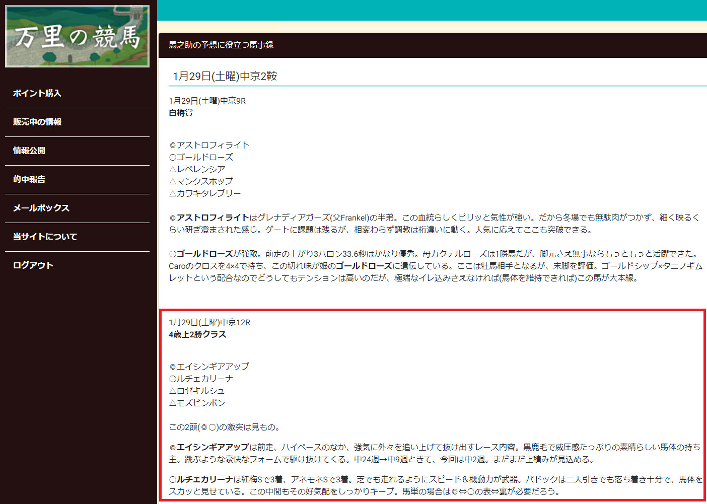 今回検証したのは「万里の競馬」という新しく見つけた予想サイトの「無料情報」検証です。