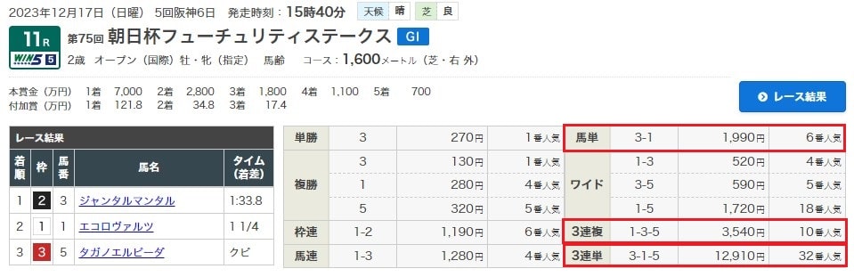 12月17日(日)阪神11R朝日杯FS(G1)で無料情報3連単129.1倍含む3馬券種的中!