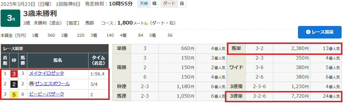 4番人気の③メイケイロゼッタが勝利したのですが、3着固定だったので悲しいことにどちらの馬券も不的中となりました…