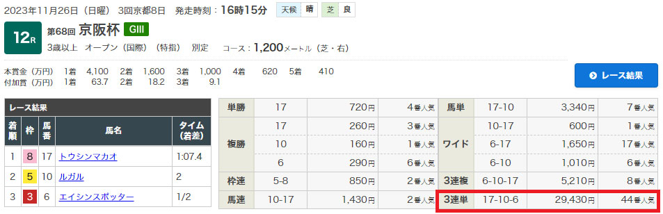 京都12R→294.3倍的中で35万3160円払い戻し!