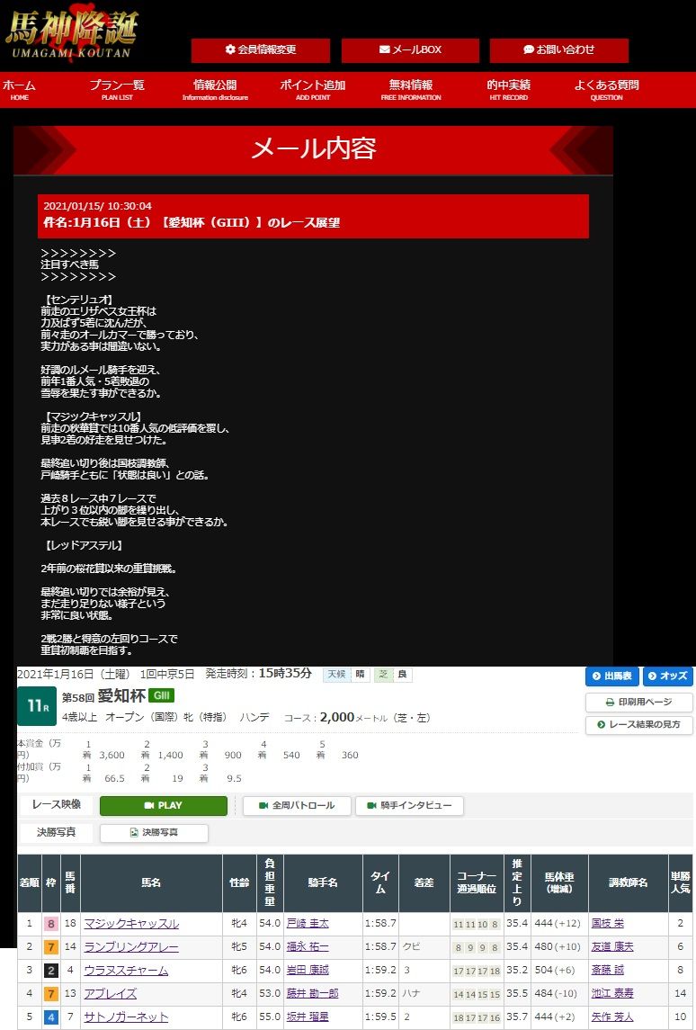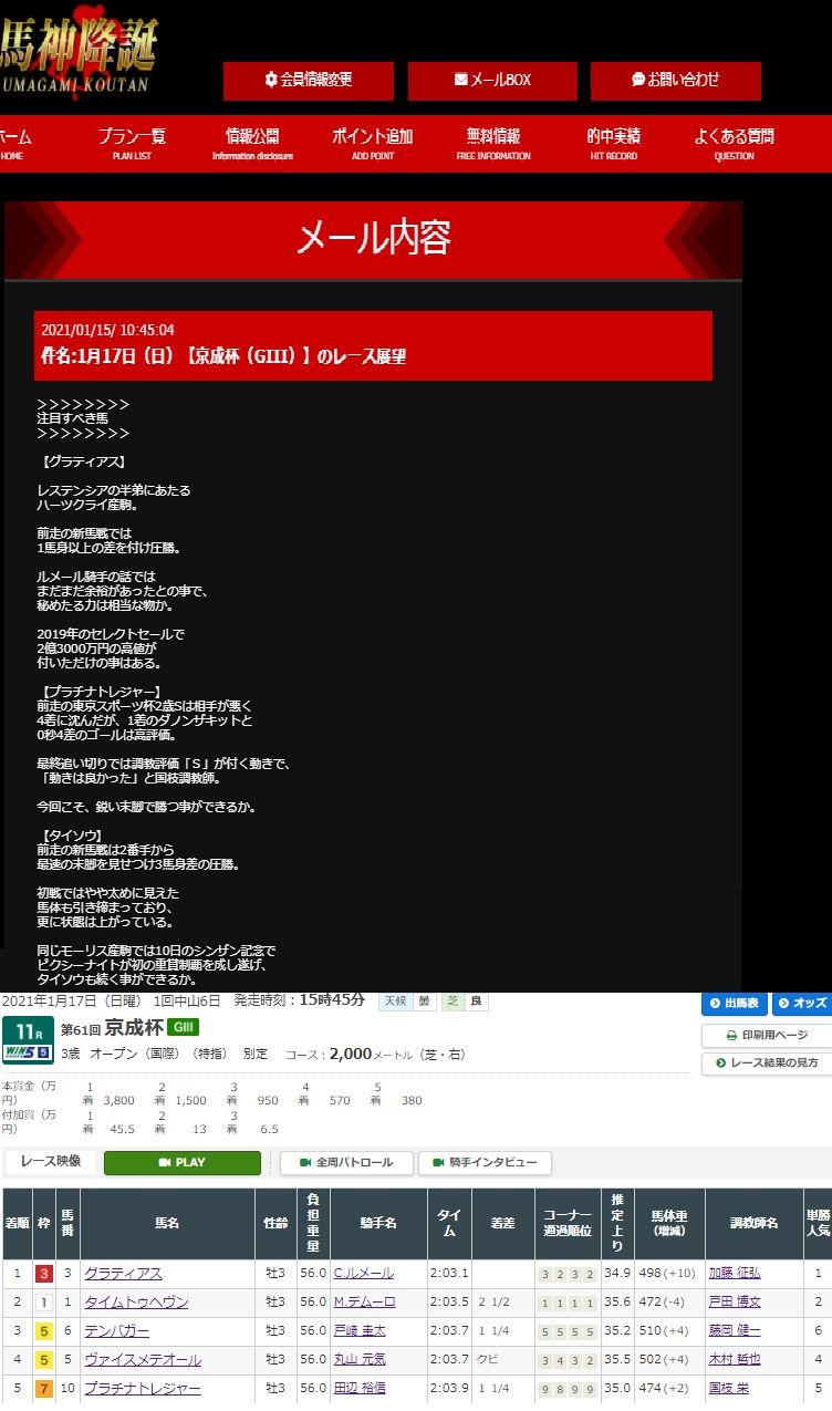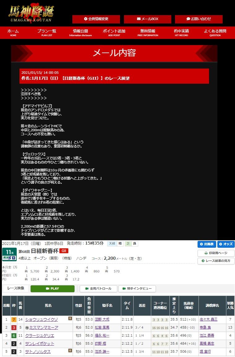 来月はG1フェブラリーS、春先のG1戦線の前哨戦が始まりますが、先週の結果からしてこの馬神降誕は平場、重賞、ともに参考にならないサイトと断言できるレベルの悪質サイト認定!