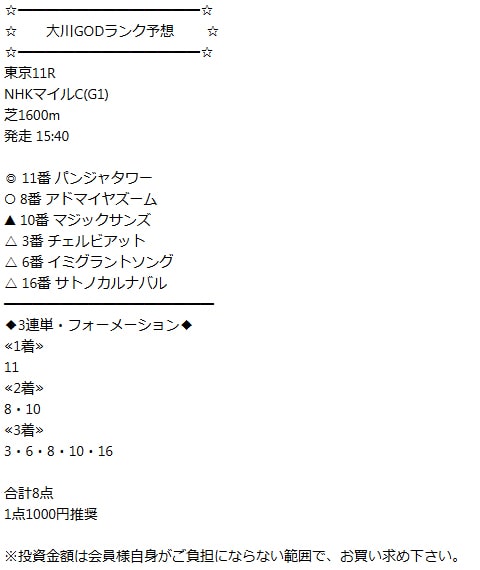 荒れるレースの予想は難航を極めますが、そんな方にこそNHKマイルカップでの輝かしい実績を残した『大川慶次郎~パーフェクト馬券メソッド~』をおススメします!