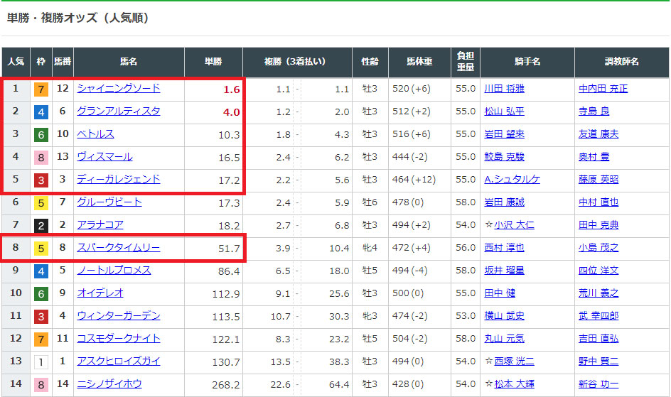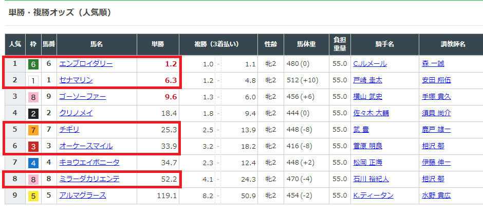 ⑫が断トツ人気で2強のオッズになっていて、結果次第では美味しい配当になりそうですね。