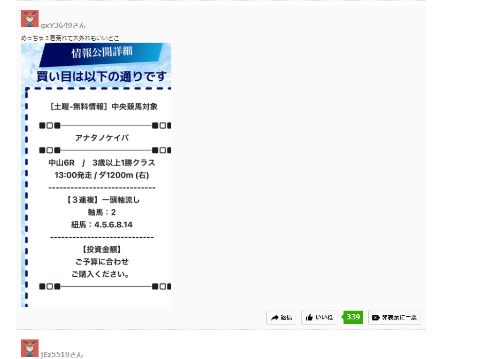 競馬リポート内に届いた口コミにも「大外れ」というコメントもあり、高確率で外れているようです。