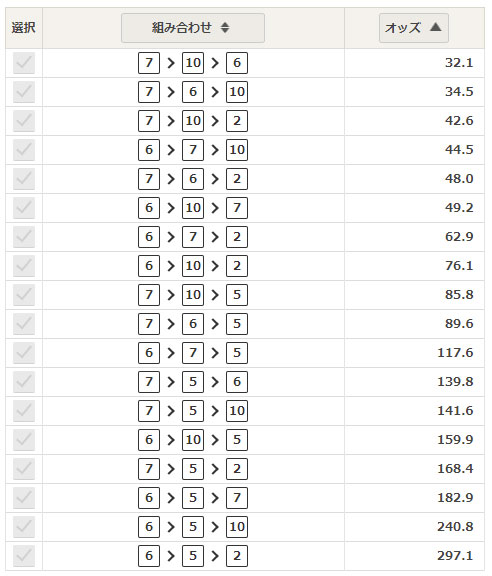 購入する際、ご覧のようにトリガミはないにしてももレース直前にオッズが下がったとしたらトリガミになる可能性もある、その理由が3連単【⑦-⑩-⑥】の決着だったなら1番人気→2番人気→3番人気と前評判通りの決着になるからだ。