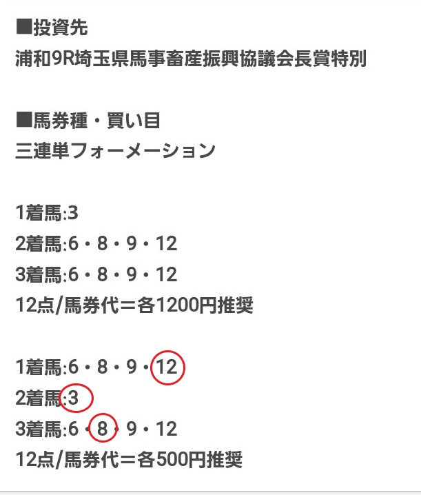 前目にいた馬でそのまま決まりました。12-8-3の買い目があったような気がしますが確認してみると。