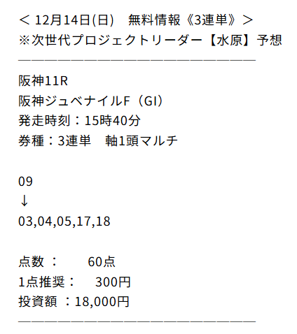 おかげさまで無料情報≪3連単≫予想で万馬券大当たり!! 阪神ジュベナイルフィリーズ3連単⑨-⑤-⑰的中で301.8倍! 1点300円でもそこそこ付いたから9万540円払い戻し! クゥー!年末に向けてツキが向いてきてるぜ!
