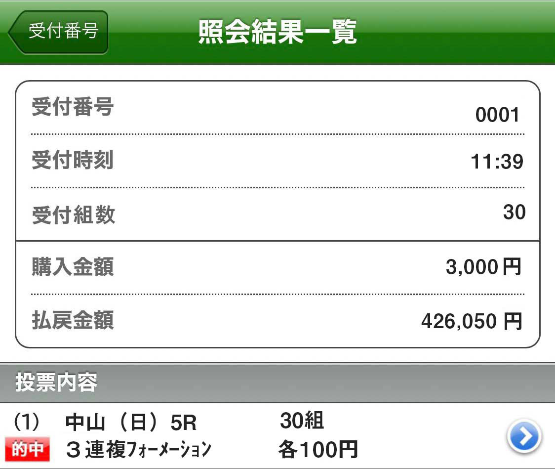 3連単70万馬券なんて絶対取れないね、ウィン5も110人しか的中者いなかったし。3連複162,740円的中で×300円で48万8220円払い戻し!