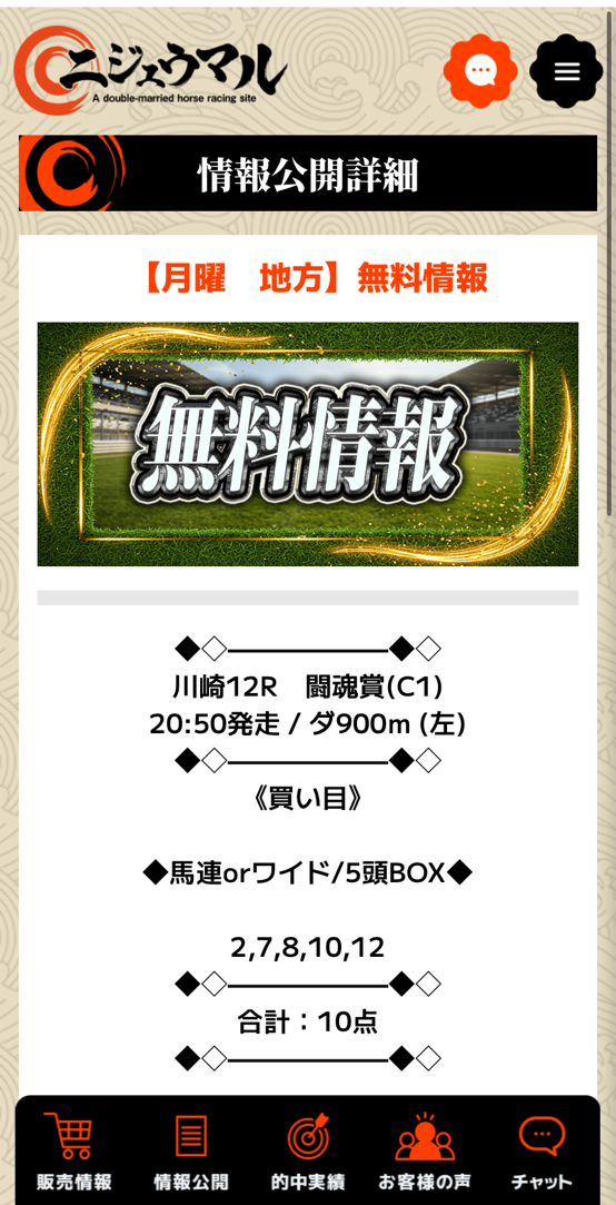 ニジュウマルの無料予想&有料予想ダブルで的中貰えました!