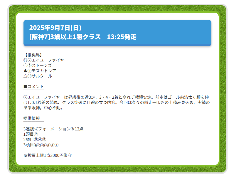 このサイトの点数を絞ったのと、圧張り予想が好きでよく多様しています、先週も安定の7万4700円的中で満足のいく結果をもらえました。